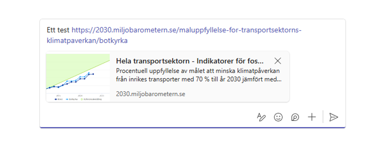 När du delar en länk till en indikator i Miljöbarometern skapas nu automatiskt en förhandsvisning med diagrammet direkt i inlägget. Det gör länkarna mer visuella, tydligare i sitt budskap och mer lockande att klicka på i exempelvis LinkedIn och Facebook.